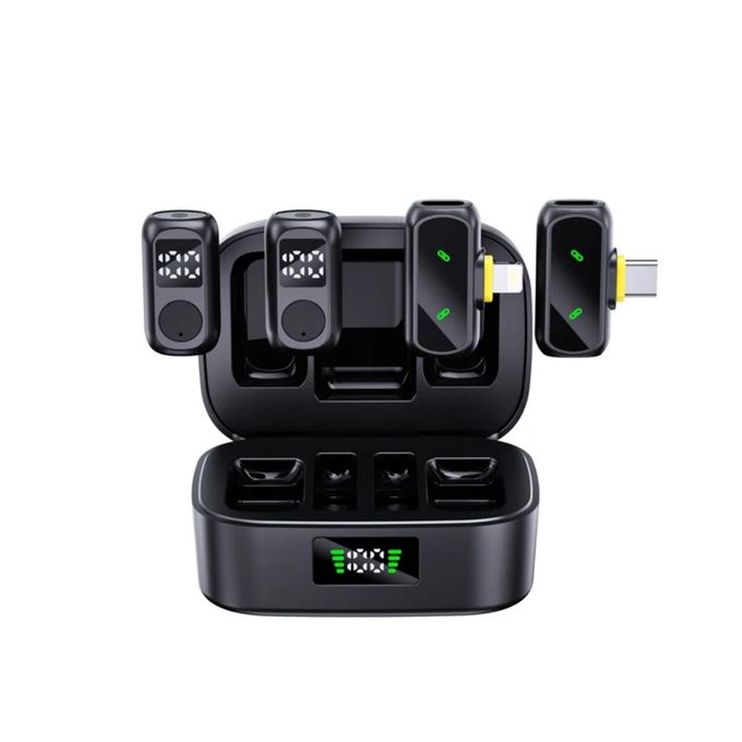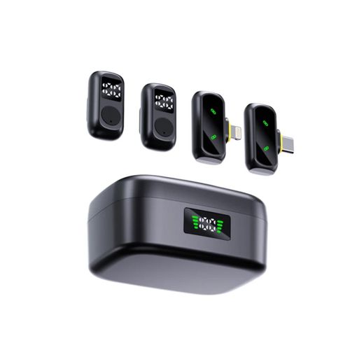 Elevate your audio quality with this 4-in-1 wireless lavalier microphone system, expertly designed for content creators, streamers, and interviewers. The set includes dual transmitter clip-on microphones and dual receivers (Lightning for iPhone/iPad and Type-C for Android/USB-C devices), making it the ultimate universal plug-and-play recording solution. Leveraging advanced 2.4G wireless technology, it guarantees an ultra-low latency, stable connection up to 20 meters (65ft) barrier-free, perfect for outdoor shoots, vlogging, and live broadcasts.