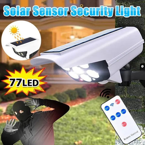 1. 2-in-1 Solar Security Light: Keep your home property safe and intruders away. Featuring 77 bright, motion-activated LEDs, a sleek, low-profile design. More realistic dummy security light.